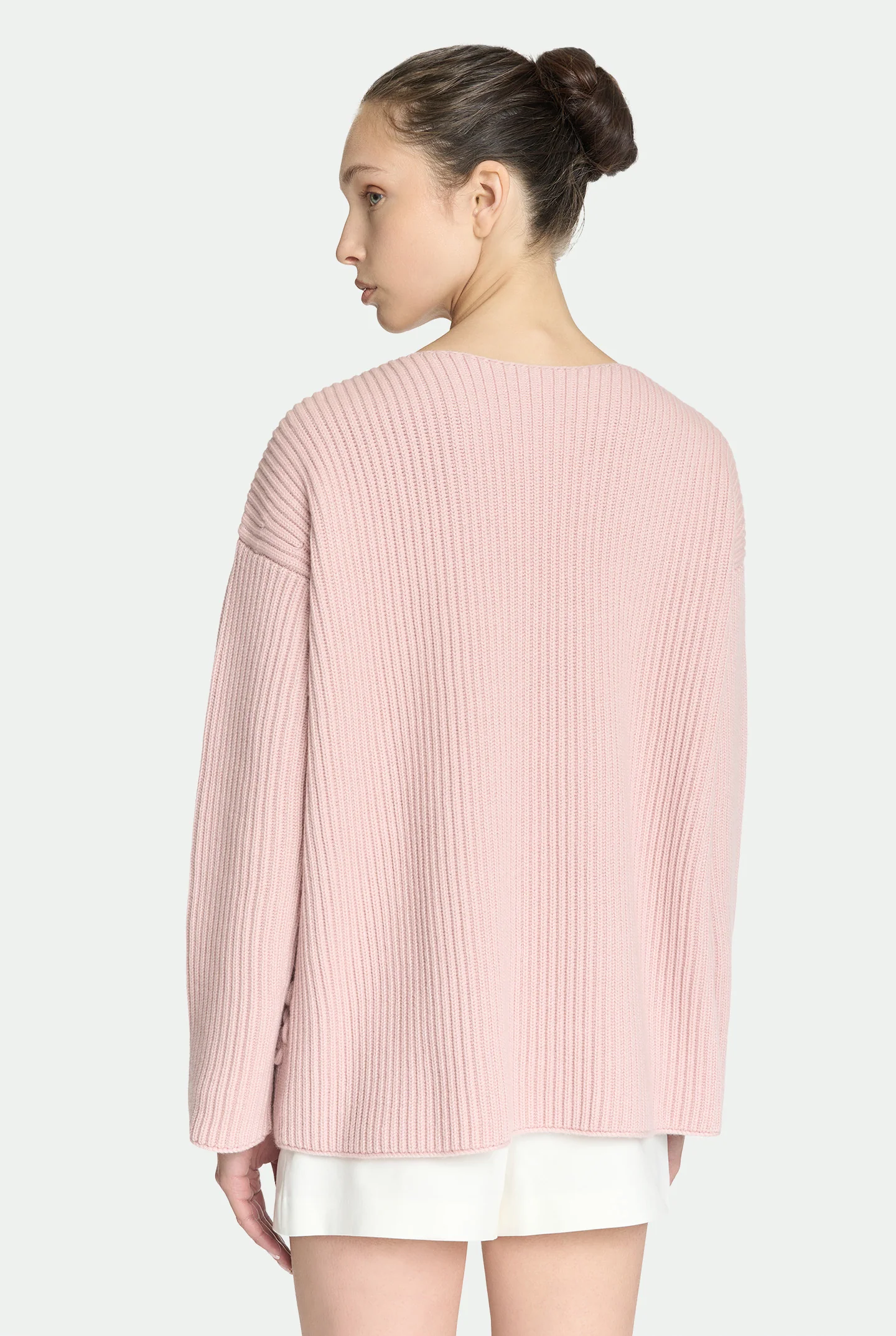 Lavorata in pregiato cashmere con raffinata trama a costine inglesi, questa maglia con scollo a V si distingue per la sua linea essenziale ed elegante. L’intervento di delicati ricami eseguiti a mano aggiunge un tocco artigianale e femminile, esaltando la purezza del filato e la sobrietà del design. Un capo pensato per accompagnare con stile i momenti più intimi della stagione.