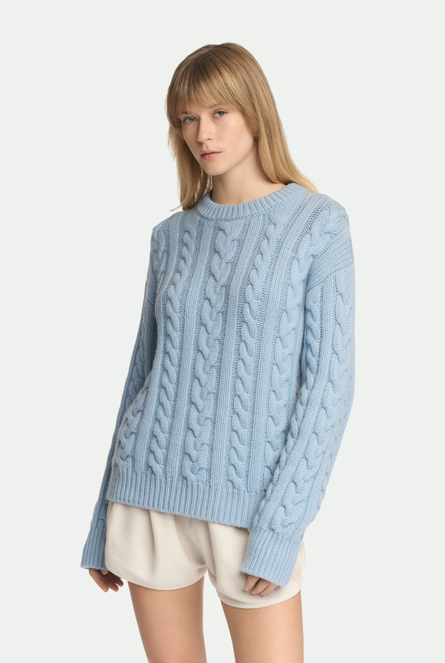 Girocollo in cashmere nel colore Malo blu con lavorazione a treccia per un effetto ricco e sofisticato. Dettagli a coste su collo, polsini e fondo completano il capo. Vestibilità regular per comfort ed eleganza senza tempo.