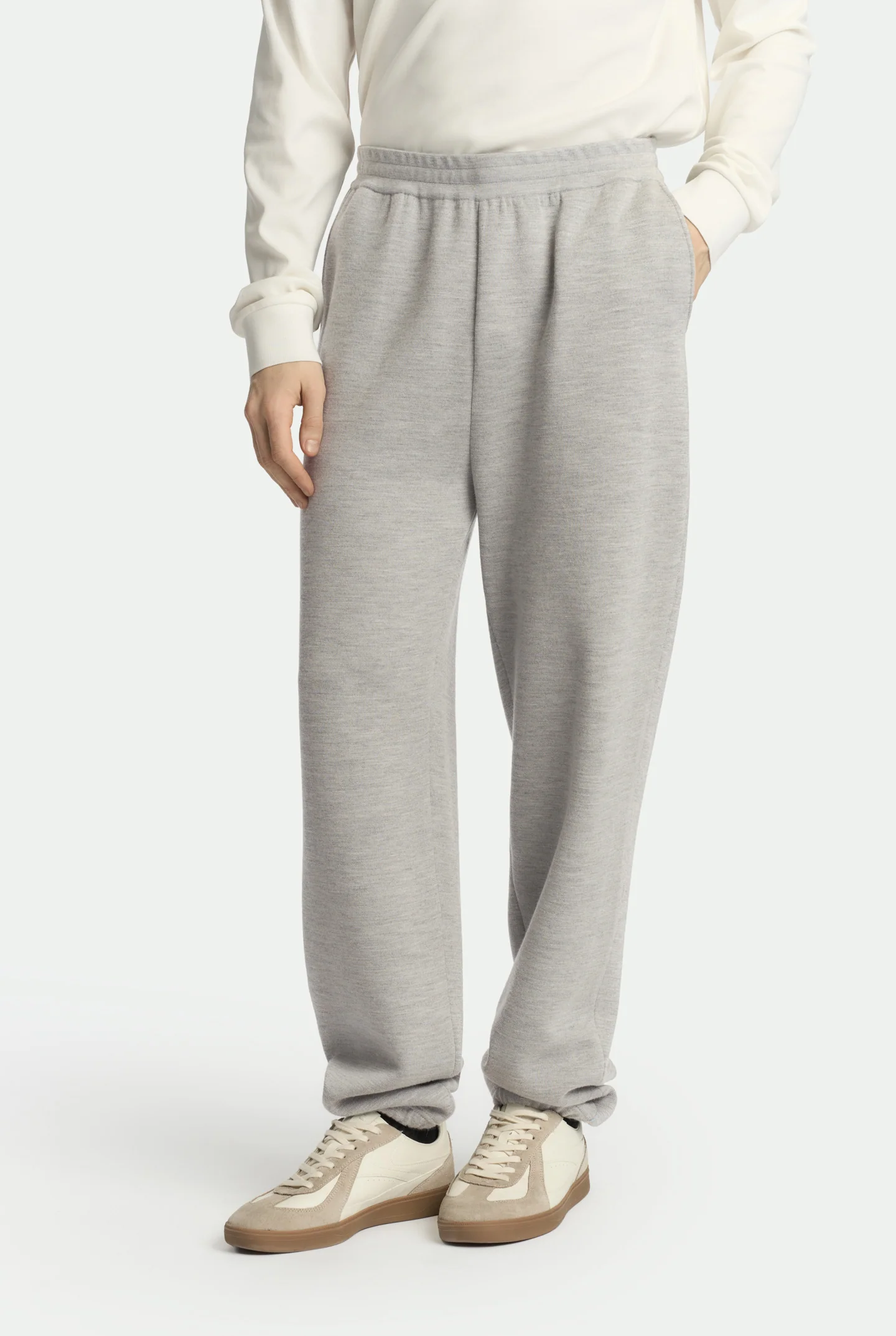 Pantalone in lana e seta double grigio cemento, con linea a gamba dritta e vestibilità regular. Vita con fascia elastica e tasca applicata sul retro per un comfort ottimale e uno stile raffinato.