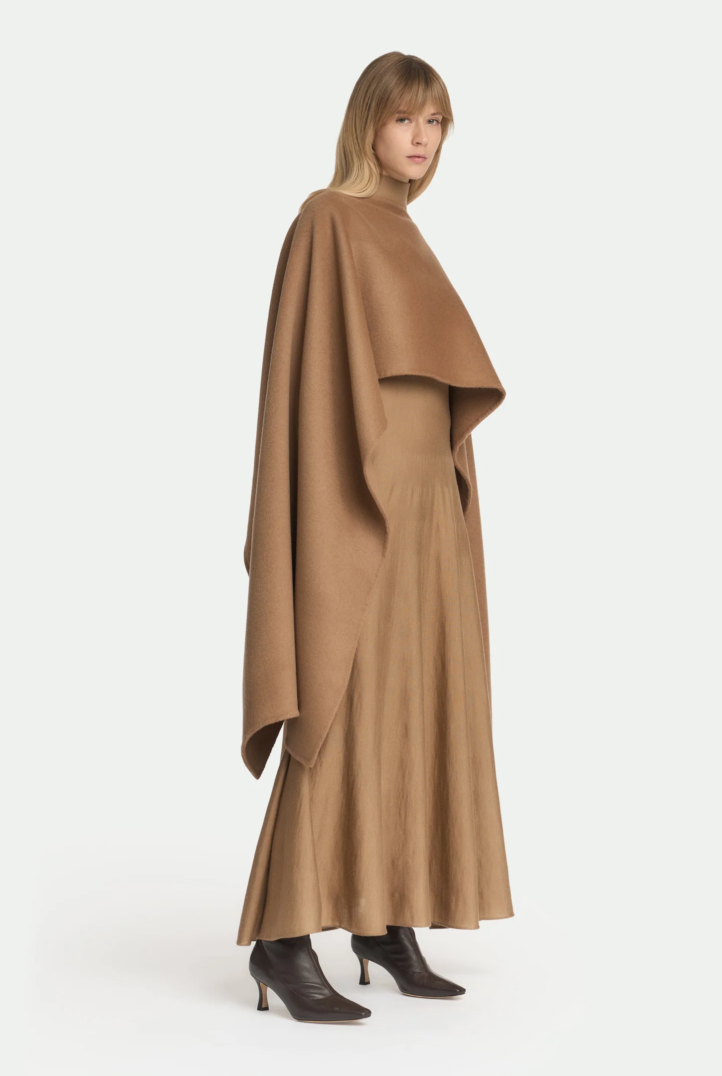 Stola in panno di lana double in colore marrone sughero. Scollo leggermente a barchetta, lunghezza crop e design avvolgente sulle maniche, per un capo elegante e versatile.